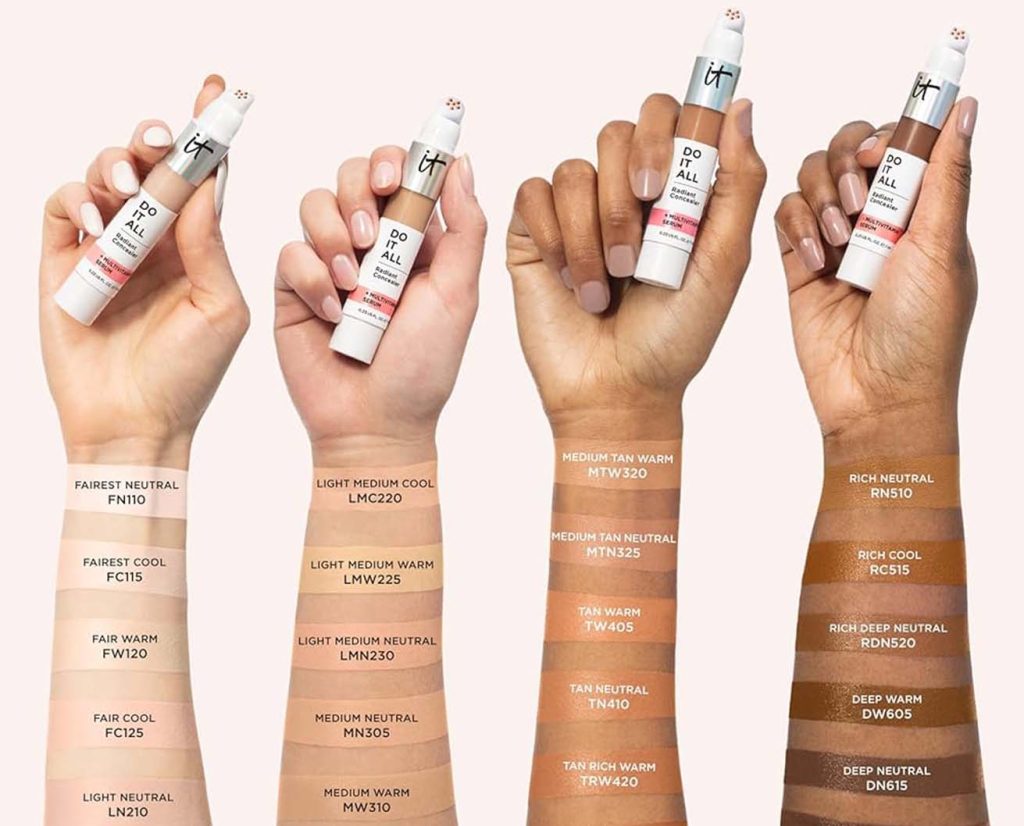 The IT Cosmetics Do It All Radiant Concealer line offers a wide variety of shades, catering to cool, neutral, and warm undertones across a range from fair to deep complexions.